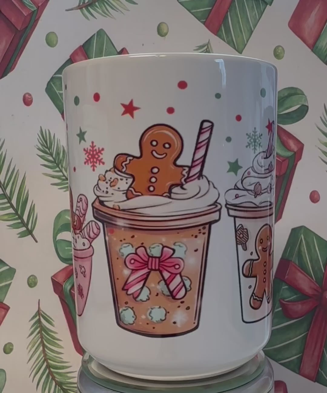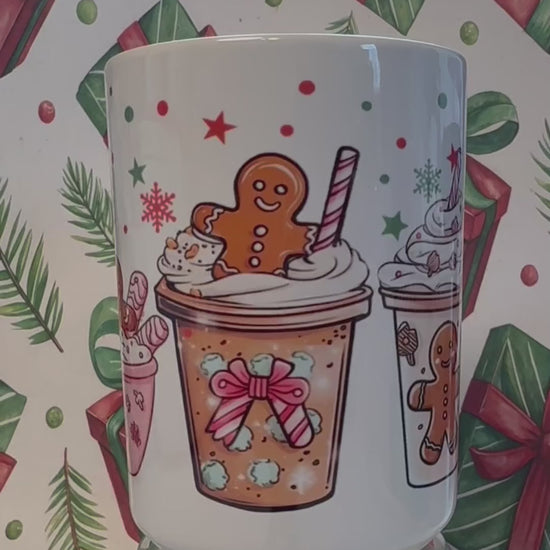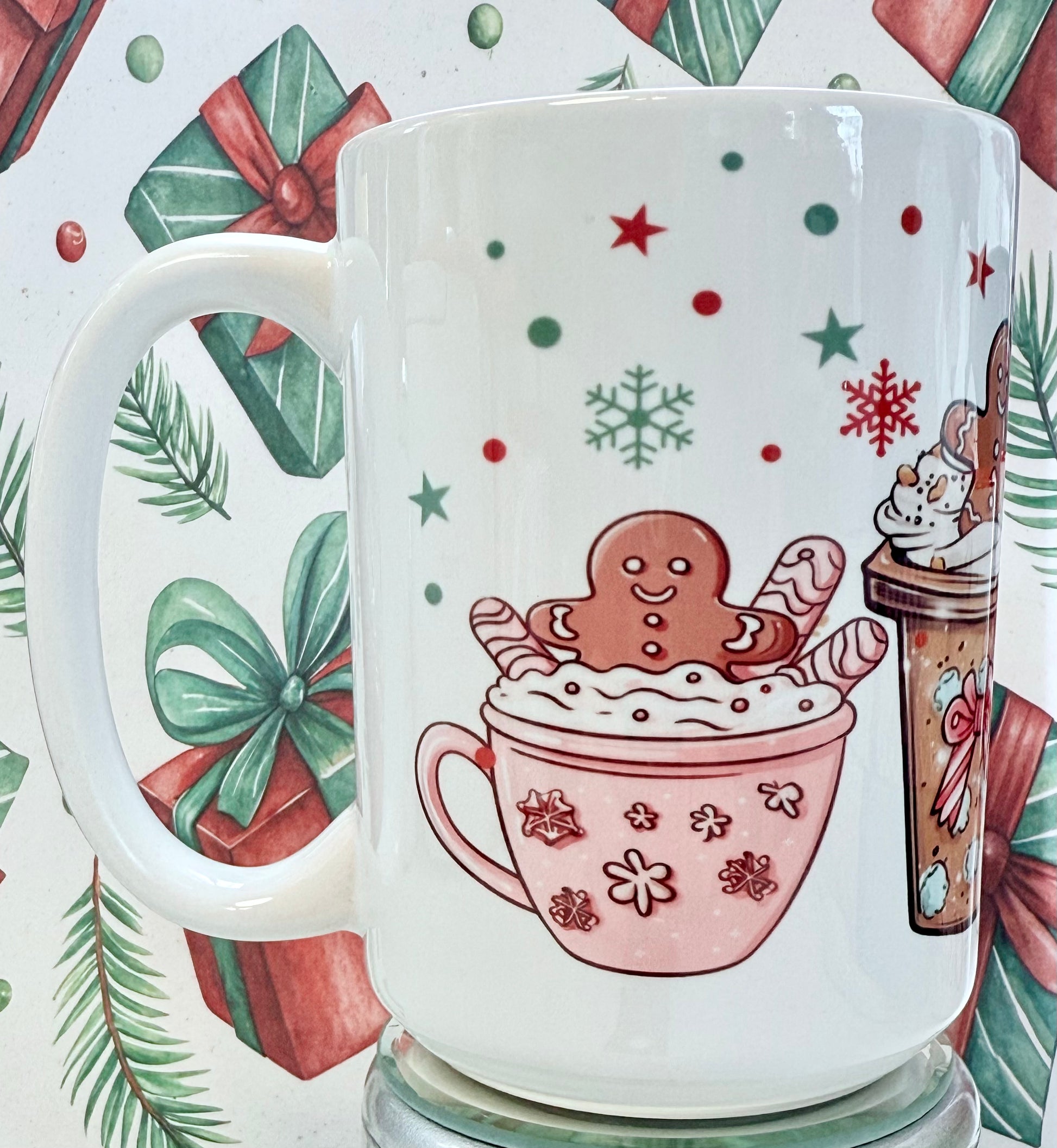 Featuring adorable pink gingerbread treats on a crisp white mug, this festive design brings playful holiday charm to your morning coffee, hot cocoa, or tea. Perfect for adding a pop of color to your kitchen or gifting to anyone who loves whimsical, festive drinkware.