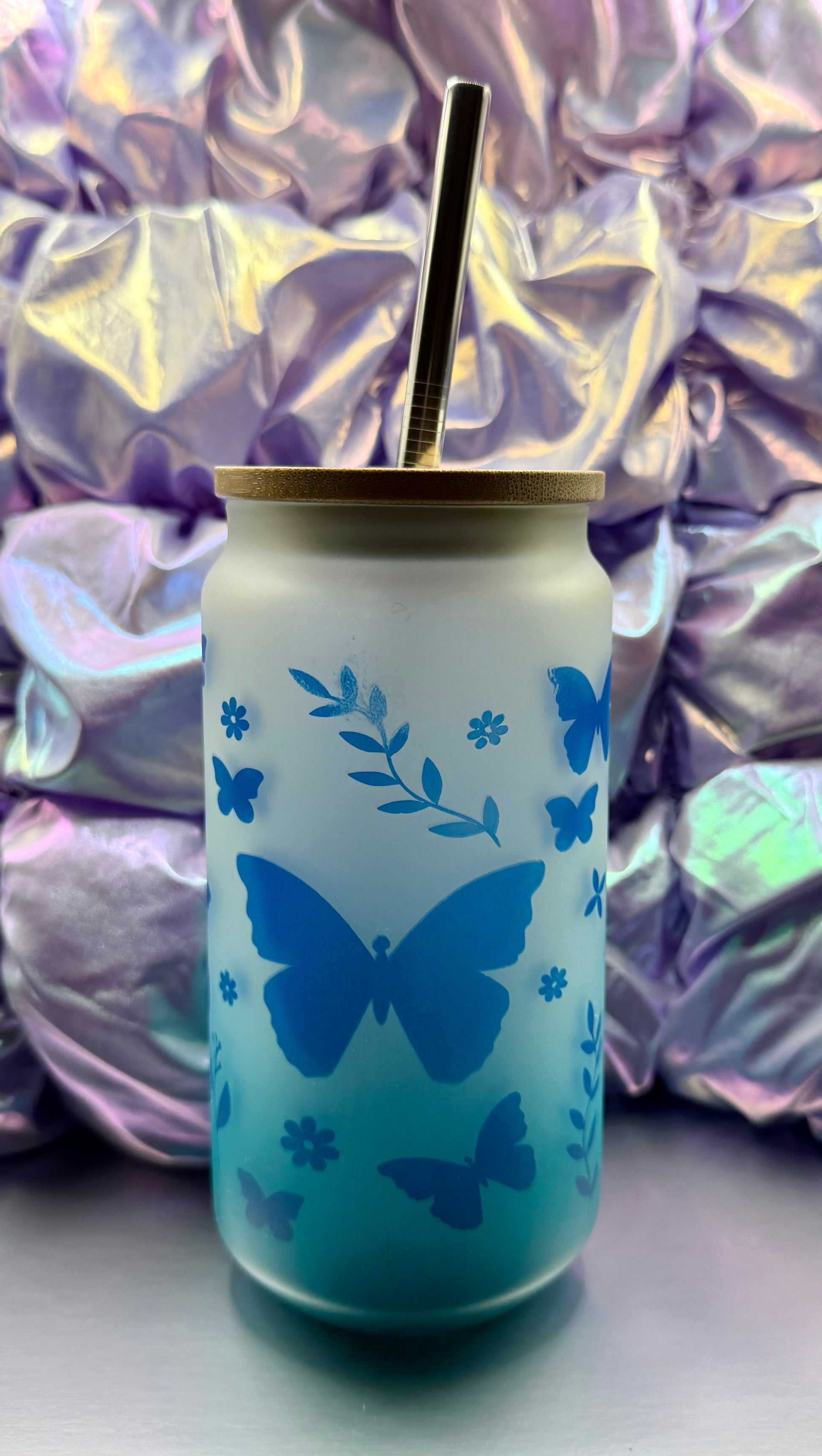 Teal Ombre Glass Can with Blue Butterflies – 16oz
